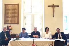 Bischof Reinhart Guib, Religionsreferentin Angela Deak, Autorin Gunda Wittig, Dozentin Alina Patru und Pfarrer Gerhard Servatius Depner bei der Buchvorstellung. Bild: hk