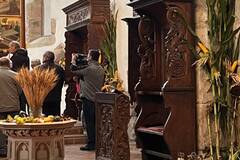 Der Chorraum der Kreuzkirche quillt fast über von Früchten, Gemüse, Feldfrüchten und Blumen. Zwiebelzöpfe hängen seitlich am Altar, dicke Rüben, direkt vom Feld, bilden ein Spalier für alle, die an diesem Gottesdienst teilnehmen und zum Abendmahl gehen. Neben der aufgeschlagenen Bibel liegt ein Brot, das in unserem Dorf gebacken wurde, an diesem Wochenende vom jungen Bürgermeister persönlich. Vater Apafi, der Bäckermeister, darf sich am Samstag ausruhen.
